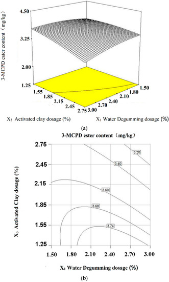 The three-dimensional response surface and contour maps were plotted based on regression equation and variance analysis, in which the interaction of two factors can be directly seen. The response surface curves and contours of degumming water (X1) and activated clay (X3) towards 3-MCPD ester were illustrated in Figure 4. When the degumming water dosage (X1) is certain, with the increase in the activated clay dosage (X3), the 3-MCPD ester content decreases. The activated clay is used to remove impurities, such as oxidative products, phosphorus, trace metals and color pigments, before deodorizing the oil. This reduction may be attributed to the adsorption of activated clay, which removed the precursors of 3-MCPD formation. The high amount of activated clay was thought to be beneficial for the greater reduction of 3-MCPDE and GE [14,28]. Meanwhile, when the activated clay dosage (X3) is certain, with the increase in water dosage (X1), the 3-MCPD ester content decreases.