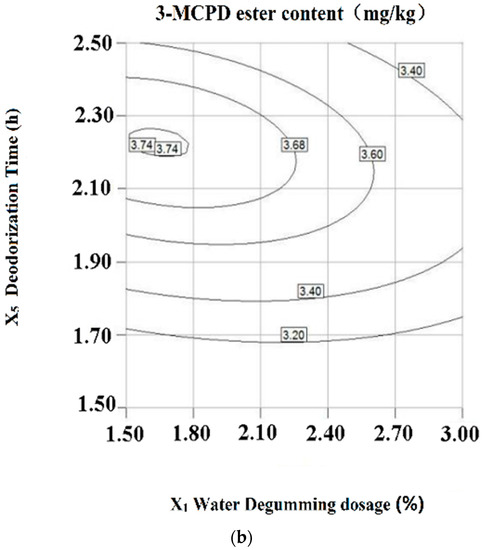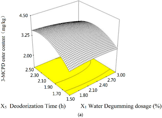 In the response surface and contour map of Figure 5, the relationship of degumming water (X1) and deodorization time (X5) with the formation of 3-MCPD ester is demonstrated. When the deodorization time (X5) is certain, with the increase in degumming water dosage (X1), the formation of 3-MCPD ester was greatly reduced, which could be primarily based on the elimination of 3-MCPD ester precursors with greater amounts of degumming water dosage [22]. When the degumming water dosage (X1) is certain, with the increase in the deodorization time (X5), the content of 3-MCPD ester increased first and then decreased. This may be because the longer the time taken for deodorization, the greater the dissolution rate of 3-MCPD ester compared with the rate of their formation [31].
