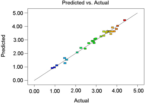 The goodness-of-fit of the predictive and actual value of the polynomial model are presented in Figure 7. The predicted values are in linear correlation with the practical experimental values, which indicated the adequacy and reliable of predictive capabilities of the models established by RSM.