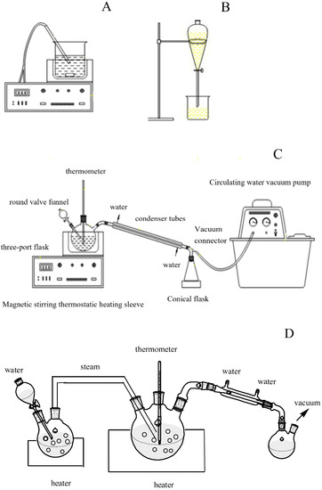 Steam distillation runs were carried out using laboratory-scale distillation equipment composed of a glass flask, magnetic stirring heating apparatus and vacuum pumps, which simulated the steam distillation decolorization process in the oil manufactory. Water was vaporized on a heated glass surface and transferred into an oil sample through a perforated glass tube. The boiling effect was achieved by introducing the steam into heated oil with the help of a vacuum, as shown in Figure 8D.