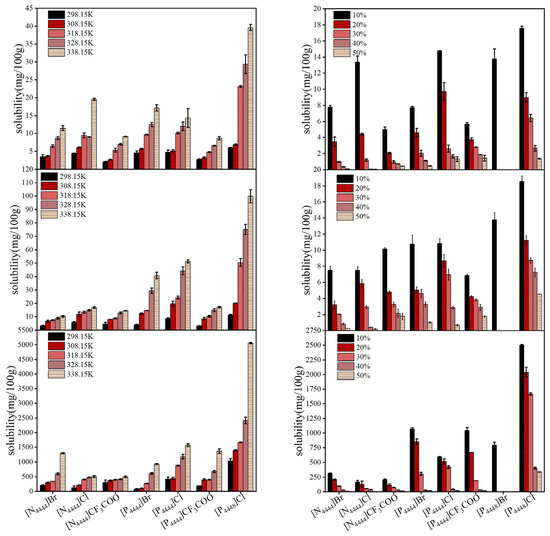 Generally, the solubility of the carotenoids in all studied ILs increased with the increase in temperature. The main reason may be that the viscosity of all ILs decreased significantly with the increase in temperature, as shown in Figure 1. On the other hand, the higher the water content in the ILs, the lower the viscosity. However, the solubility of the carotenoids decreased with the increase in water content. One potential explanation for the tendency might be that the anions and cations of the ILs were extremely solvated in excess water [41]. Similarly, the solubility of lamotrigine in aqueous mixtures of 1-octyl-3-methylimidazolium bromide IL decreased with the increasing concentration of water [42]. However, it should be stressed that pure ILs showed a very high viscosity, which is not conducive to extraction applications. For example, the viscosity of [P4448]Cl free of water at 298.15 K was 1260.0 mPa·s−1, which was 18.5 times the viscosity in the presence of 10% water (68.0 mPa·s−1). Therefore, increasing the temperature to 328.15 K and adding water up to 20% are very necessary and beneficial to obtain a higher solubility of carotenoids in phosphonium- and ammonium-based ILs.