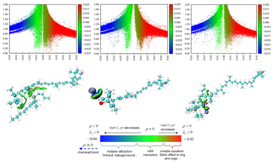 DFT studies allow us to interpret the mechanism of ILs with carotenoids, bonding types, and the strength of the bonding in the considered IL–carotenoid systems. Figure S1 shows the optimized scatter diagrams of [P4448]+–carotenoid, Cl−–carotenoid, and [P4448]Cl−–carotenoid structures. To explore the interaction forces, the interactions between ions and carotenoids were investigated using the reduced density gradient (RDG) and independent gradient model (IGM). The RDG analysis can distinguish between regions of the system with different characteristics and clearly shows areas of strong attraction [47]. The interaction force for carotenoids with [P4448]Cl can be seen in Figure S2. For example, there is a large number of green scatter points perpendicular to the horizontal coordinate sign in the range of sign(λ2)⍴(r) of −0.01 to 0.01 au, indicating the presence of strong van der Waals interactions between conjugated double bonds in lutein with the cation of [P4448]Cl (Figure 3). Moreover, there are more dense blue scatters in the range of sign(λ2)⍴(r) of −0.03 to −0.05 au, suggesting hydrogen bonding between the H atom in lutein and the Cl− atom in IL.
