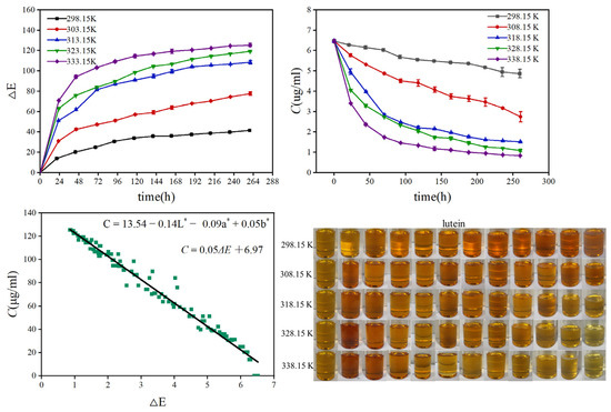 Changes in ΔE (total color deviation) and concentration (C) of lutein with time, the relationship between ΔE and lutein concentration, and pictures of the [P4448]Cl aqueous solution (wwater = 20%) containing lutein during storage for 12 days at 298.15–338.15 K.