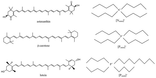 A promising alternative is the use of ionic liquids (ILs). ILs are molten salts formed by organic cations and organic or inorganic anions and have been widely used as solvents in the separation and purification of bioactive compounds [16,17,18]. The most attractive characteristics of ILs are their negligible vapor pressure, improved solvation ability, non-flammability, and high ionic conductivity and solubility. In a previous study, 1-hexyl-3-methylimidazolium acetate ([C6mim][OAc]) improved the yields of zeaxanthin by 23.08% in comparison to a mixture of hexane, acetone, and ethanol [19]. The extraction yield of lutein from Chlorella reached 5.6 mg/g when using 1-butyl-3-methylimidazolium bromide ([C4mim]Br), which was higher than when using ether (4.7 mg/g) [20]. It should be emphasized that most studies have focused on imidazolium-based ILs. In fact, the ILs with higher shielded charges, such as tetrabutylammonium chloride ([N4444]Cl) and tetrabutylphosphonium chloride ([P4444]Cl), show higher hydrophobicity and are more suitable for the extraction of hydrophobic biomolecules. It was reported that the solubility of curcumin can reach nearly 55 mg/mL in aqueous solutions of tetradecyl triethyl ammonium bromide ([N22214]Br), which is greater than its solubility in 1-octy-3-methylimidazolium bromide ([C12min]Br) (15 mg/mL) [21]. However, limitations of the study include the lack of data concerning the carotenoid dissolution behavior and stability in ammonium- and phosphonium-based ILs, which is the main potential cause of insufficiency in the extraction of natural carotenoids.