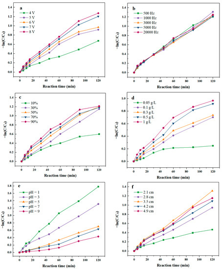 Effect of operation parameters on degradation rate of SND. (a) Voltage of PEF; (b) Frequency of PEF; (c) Duty cycle of PEF; (d) Initial PMS concentration; (e) Initial pH value; (f) Electrode inter distance.