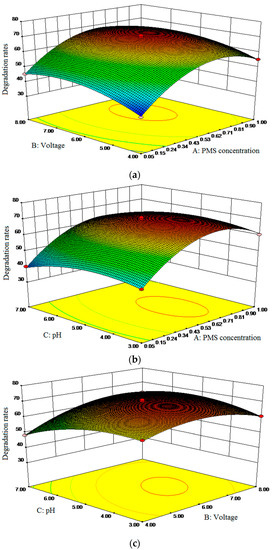 Interaction effect of single parameters on the degradation rate of CIP. (a) PMS concentration and voltage; (b) PMS concentration and pH; (c) pH and voltage.