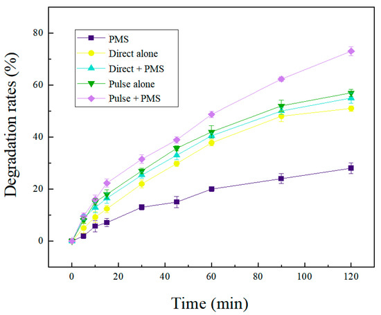 For further investigation of the effect of different systems on the SND degradation, the PEF/PMS, CEF/PMS, PEF, CEF and PMS system were analyzed (Table S7). It can be seen from Figure 3 that the degradation rate of SND varied greatly with different reaction systems. The degradation rate of SND degraded with PMS alone was the lowest, only 18% after 2 h reaction. It has been reported that PMS can be activated at room temperature (22 C), but the oxidation effect was weak so the degradation of SND was not substantial. In the CEF system, the SND degradation rate was 50%. In the CEF treatment system, there were two main reasons for SND oxidation: (i) direct oxidation by anode; SND was oxidized by direct electron transfer reaction on the anode surface. (ii) Mediate oxidation by active species generated by electrolysis; •OH generated on the graphite anode surface by water electrolysis which has an indirect oxidation effect on SND. H2O2 and •O2− produced by the cathodic reduction as shown in Equations (9) and (10) [44] also have an indirect oxidation effect on SND.