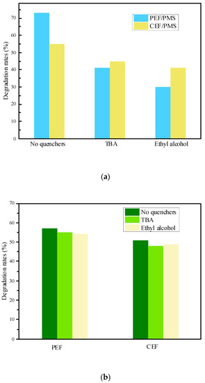As shown in Figure 4a, the SND degradation with different quenchers in the PEF/PMS system were 72%, 40% and 30%, respectively, indicating that SND in the PEF/PMS system was partially degraded by free radical oxidation. The degradation rate of SND reduced by 32% as the addition of TBA, which was mainly caused by the quenching of •OH in the system, indicating the generation of •OH in the system. The degradation rate of SND decreased by 43% when MeOH was added, indicating that both SO4•− and •OH were generated in the system. In contrast, the difference between TBA inhibition and MeOH inhibition was 10%, indicating that the amount of SO4•− in the system was less than that of •OH. On the other hand, •OH plays a certain role on the formation of SO4•−. In addition, degradation rates of SND under different inhibitor conditions in the CEF/PMS system were 54%, 44% and 40%, respectively. By comparing with the PEF/PMS system, it can be seen that the quenching effect of inhibitors on SND degradation in the CEF/PMS system is far less than that in the PEF/PMS system under the same conditions, which further proved that the PEF is more likely to activate PMS to produce more •OH and SO4•−.