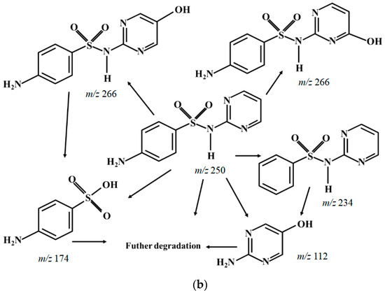 As shown in Figure 5a, four typical intermediates are detected, which are m/z 112, m/z 234, m/z 174 and m/z 266, respectively. It has been widely reported that pKa of sulfadiazine is around 6.5 [48], which implies sulfadiazine in solution is mainly in a species carrying positive charge when pH is 3.5. As shown in Figure 5b, there might be three main pathways for SND degradation. Firstly, SND (m/z 250) attacked by SO4•− and/or •OH, produces m/z 266 by substitution reaction [47], then m/z 174 is produced by loss of pyrimidine group [47,49], and then further degradation. Secondly, SND may also undergo deamination to produce m/z 234. Fragment m/z 218 of m/z 234 by loss of –NH2, was detected, and further generated m/z 174 and m/z 112 [50]. Thirdly, active species SO4•− and/or •OH oxidized sulfamine structure of SND and produced m/z 174.