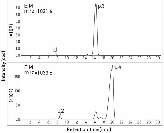Ion mass chromatograms of commercial α-tomatine determined by LC-MS. Condition: column, Inertsil ODS-3v [5 μm, 4.0 mm × 250 mm]; column temp, 20 °C; injection volume, 20 μL; mobile phase, acetonitrile/20 mM ammonium acetate in water (35:65, v/v); flow rate, 0.8 mL/min.