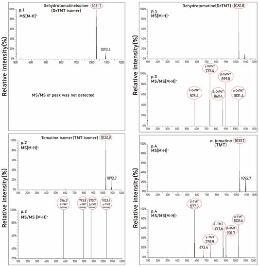 Since the molecular ion peaks (m/z) of peak 1 of the four evaluated samples (1031.7, 1030.7, 1030.8, and 1030.8) shown in Table 1, Table 2 and Table 3 are identical to those of peak 3 associated with dehydrotomatine (1030.8, 1030.6, 1031.4, and 1031.5), it is most likely that the compound associated with peak 1 is an isomer of dehydrotomatine. Similarly, the molecular ions associated with peak 2 (1032.8, 1032.7, 1033.2, and 1032.7) of the unknown compound are identical to those observed with authentic α-tomatine associated with peak 4 (1033.7, 1032.8, 1032.9, and 1033.6), suggesting that peak 2 might be associated with a glycoalkaloid that is an isomer of α-tomatine. The MS/MS fragments or fragmentation patterns shown in Table 1, Table 2 and Table 3 seem consistent with the possibility that the two unknown peaks are isomeric forms of dehydrotomatine and α-tomatine, respectively. This conclusion is reinforced by the mass spectral fragmentation data obtained using TOF/MS that correspond to the results shown in Table 1, Table 2 and Table 3.