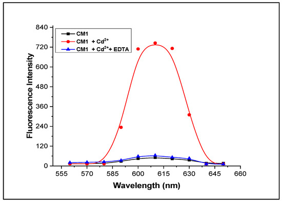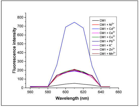Upon exciting chemosensor CM1 at λex = 390 nm, its fluorescence emission spectrum was recorded in the range of 230–800 nm. A weak fluorescence emission spectrum was observed at λem = 610 nm. Thus, at these wavelengths of excitation and emission, further fluorometric analyses were carried out.