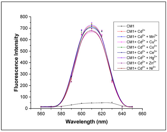 Interference study of CM1 (10 µM) and Cd2+ (18 µM) and interfering metal ions (200 µM) at λex = 390 nm and λem = 610 nm.