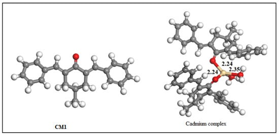 The detection of Cd2+ with the help of chemosensor CM1 was validated through computational investigation concerning the stability, orbital overlapping of Cd2+ and CM1, bond angles, bond lengths, and optimized geometry of the resulting cadmium complex. The optimized geometry of the CM1 and its cadmium complex are shown in Figure 8. The CM1 acted as a monodentate ligand attached through an oxygen atom to the Cd2+ ion, forming a stable distorted tetrahedral geometry.