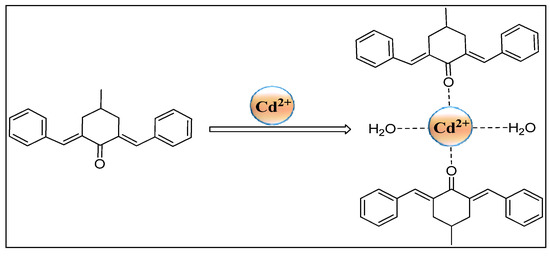 Herein, a novel optical chemosensor, (CM1 = 2, 6-di((E)-benzylidene)-4-methylcyclohexan-1-one), was designed/synthesized and characterized by 1H-NMR and FT-IR spectroscopy. The experimental observations indicated that CM1 is an efficient and selective chemosensor towards Cd2+, even in the presence of other metal ions, such as Mn2+, Cu2+, Co2+, Ce3+, K+, Hg2+,, and Zn2+ in the aqueous medium. The newly synthesized chemosensor, CM1, showed a significant change in the fluorescence emission spectrum upon coordination with Cd2+. The formation of the Cd2+ complex with CM1 was confirmed from the fluorometric response. The 1:2 combination of Cd2+ with CM1 was found optimum for the desired optical properties, which was confirmed through fluorescent titration, Job’s plot, and DFT calculation. Moreover, CM1 showed high sensitivity towards Cd2+ with a very low detection limit (19.25 nM). Additionally, the CM1 was recovered and recycled by the addition of EDTA solution that combines with Cd2+ ion and, hence, frees up the chemosensor.
