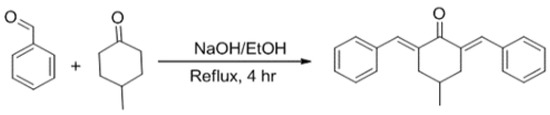 The chemosensor CM1/[(2,6-di((E)-benzylidene)-4-methylcyclohexan-1-one)] was synthesized as shown in (Scheme 2) [48,49,50]. Ethanolic solution of benzaldehyde (1.06 g, 10 mmole) and 4-methyl cyclohexanone (0.49 g, 5 mmole) were mixed with continuous addition of sodium hydroxide (40%). The resulting mixture was refluxed for 4 h. The mixture was cooled to room temperature and evaporated to afford the desired product, CM1, as a yellow-colored solid. The crude products were purified by recrystallization from ethanol. Melting point (M. P): 159 °C. Yield: 78%. IR (KBr, cm−1): 1710 cm−1 (C=O stretching), 1628–1646 cm−1 (C=C stretching), 3000–2960 cm−1 (C-H stretching) [51], 1H-NMR (300 MHz, ppm): δ 7.82 (bs, 2H, CH=C6H5), 7.34–7.50 (m, 10H, ArH), 3.07 (dd, JAB = 15.9, J = 3.6 Hz, 2H, CH2), 2.53 (m, 2H, 2CH2), 1.89 (m, 1H, CH), 1.08 (d, 3H J = 6.6 Hz, 3H, CHCH3) [52].