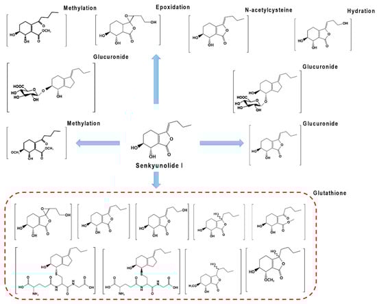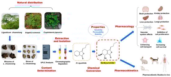 - He, C.-Y.; Wang, S.; Feng, Y.; Liang, S.; Lin, X.; Xu, D.-S.; Ruan, K.-F. Pharmacokinetics, tissue distribution and metabolism of senkyunolide I, a major bioactive component in Ligusticum chuanxiong Hort. (Umbelliferae). J. Ethnopharmacol. 2012, 142, 706–713. [Google Scholar] [CrossRef] [PubMed]