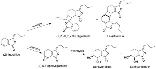 Duan and colleagues [25] studied the reaction products of LIG in an electrochemical reactor. Five products were separated and identified, including two dihydroxyl products SI and SH, as well as an epoxide 6,7-epoxyligustilide. The latter is a key intermediate in the transformation of LIG into SI and SH.
