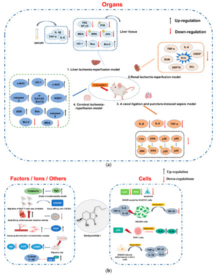 Blood supply is critical for ameliorating tissue and organ damage caused by persistent ischemia. SI can attenuate hepatic and renal I/R injury through antioxidant, anti-inflammatory, and anti-apoptotic effects. SI (50, 100, and 200 mg/kg) was injected intraperitoneally to the modified liver I/R murine model. As a result, SI (200 mg/kg) decreased TNF-α, IL-1β, and IL-6 in serum; inhibited the phosphorylation of p65 NF-κB and MAPK kinases; and reduced the expression of Bax and Bcl-2. Furthermore, SI can alleviate H2O2-induced oxidative damage in HuCCT1 cells, promote the nuclear translocation of Nrf-2, and reduce the levels of ROS and MDA [74]. Administration on renal I/R injury mice confirmed that SI can protect renal function and structural integrity, reverse increases in ischemia–induced blood urea nitrogen (BUN) and serum creatinine (SCr), ameliorate pathological renal damage, and inhibit TNF-α and IL-6 secretions. Furthermore, reductions in ROS production as well as endoplasmic reticulum stress-related protein expressions are involved in the potential protection mechanism [75].