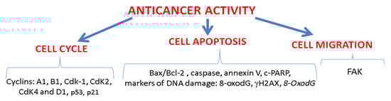 Anticancer activity is another explored direction of action of Droseraceae and Nepenthaceae plants, and some reports have been published on this topic. The investigations were based on both in vitro studies on cell lines and in vivo assays using animal models. Basic investigations included cytotoxicity assays based on cellular metabolic activity tests (MTT—mitochondrial dehydrogenase activity, LDH—lactate dehydrogenase activity) or permeability of cell membrane tests (TB—trypan blue). Additionally, some molecular mechanisms associated with anticancer activity have also been studied, focusing on (i) the cell cycle (cell cycle regulatory proteins: cyclin A1, cyclin B1, and Cdk-1), (ii) the apoptotic pathway (Bax/Bcl-2 ratio, caspase, annexin V, markers of DNA damage: 8-Hydroxy-2-Deoxyguanosine, γH2AX) and (iii) cell migration (FAK protein—focal adhesion kinase) (Figure 3). All these mechanisms are of great significance in the development of anticancer therapies [].
