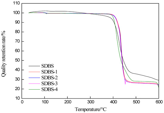 Thermogravimetric analysis of SDBS, SDBS-1, SDBS-2, SDBS-3 and SDBS-4 was conducted, as shown in Figure 1. It can be seen from the temperature graph (TG) in Figure 1 that the SDBS begins to lose weight slowly at 200 °C, intensely at 400 °C and slowly at 480 °C. SDBS-1 to SDBS-4 begin to lose weight at 410 °C and basically end at 470 °C. The weight loss process was much faster than that of the SDBS, and there was only one stage in this weight loss process. After the SDBS’s weightlessness, about 30% of the residue was left, while SDBS-1 to SDBS-4 had about 23% residue. The reason why the temperatures of SDBS-1 to SDBS-4 at the beginning of weightlessness were slightly lower than that of the SDBS is that the introduction of hydroxymethyl added another carbon to the molecular branched chain, and the hydroxyl may have also formed intermolecular hydrogen bonds, thereby improving the thermal stability of the molecules [13,14,15].