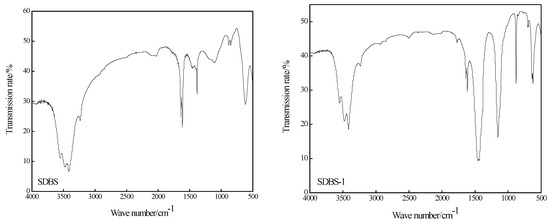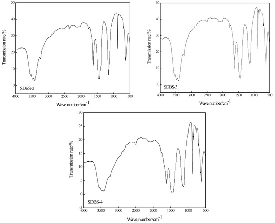 Infrared characterizations of SDBS, SDBS-1, SDBS-2, SDBS-3 and SDBS-4 were carried out. The spectra are shown in Figure 2. As shown in Figure 2, SDBS-1 to SDBS-4 have broad and strong absorption peaks from about 3550 to 3100 cm−1. At this time, the characteristic absorption peaks of the free and associative hydroxyl groups overlap, indicating that these products all contain hydroxyl groups. At the same time, it can be seen that the spectra of SDBS-1 to SDBS-4 are obviously different from those of the SDBS. The absorption peaks of SDBS are very narrow, at about 1800 and 800 cm−1, and the absorption peak at 800 cm−1 is weak, which is a typical characteristic absorption peak of paradisubstituted benzene [15]. The infrared spectra of SDBS-1 to SDBS-4 show absorption peaks at about 1870 cm−1 and 1650 cm−1 and corresponding absorption peaks at about 800 and 850 cm−1, especially for SDBS-4, which has a typical characteristic absorption peak for triple-substituted benzene. At the same time, the wave number of each absorption peak is smaller than the theoretical value. This is because the hydroxymethyl group was an electron-donor group that caused a red shift in the absorption wavelength and decreased the wave number [16]. All of these indicate that the expected products were obtained.