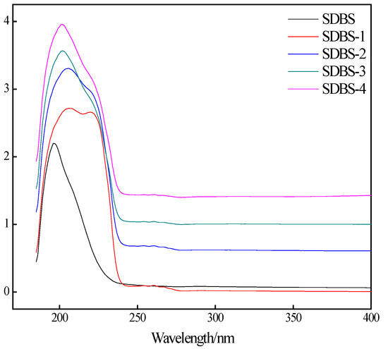 Ultraviolet characterizations of SDBS, SDBS-1, SDBS-2, SDBS-3 and SDBS-4 were performed, and the spectra are shown in Figure 3. It can be seen from Figure 3 that the SDBS series has similar ultraviolet absorption peaks, except SDBS-1, and all have strong absorption peaks at 220 nm, which is a typical absorption peak for the π-π* transition of the C=C bond. In addition, the other four surfactant absorption values are higher than that of the SDBS, and the wavelength at the peak is slightly smaller than that of the SDBS, possibly due to the introduction of hydroxymethyl. Hydroxymethyl is a typical electron-donor group that is superconjugated when attached to a benzene ring, resulting in a blue shift at the maximum absorption wavelength [17]. In addition, SDBS-1 also has an absorption peak at about 230 nm. This may be caused by the n-σ* transition of the S=O bond.