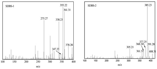 The mass spectrum was the same, since the molecular ion peaks of SDBS-2, SDBS-3 and SDBS-4 were substantially equal. Therefore, only the spectra of SDBS-1 and SDBS-2 are listed in Figure 4. Figure 4 shows that m/z 378.28 is the molecular ion peak of SDBS-1, m/z 361.31 is the peak of [M-OH], m/z 355.22 is the peak of [M-Na], m/z 347.23 is the peak of [M-CH2OH], m/z 338.23 is the peak of [M-OH-Na] and m/z 275.27 is the peak of [M-SO3Na], respectively. As shown in Figure 4, m/z 408.31 is the peak of SDBS-2, m/z 391.28 is the peak of [M-OH], m/z 385.23 is the peak of [M-Na], m/z 377.25 is the peak of [M-CH2OH], m/z 368.24 is the peak of [M-OH-Na] and m/z 305.21 is the peak of [M-SO3Na], respectively. All of these indicate that the reaction produced the target product.