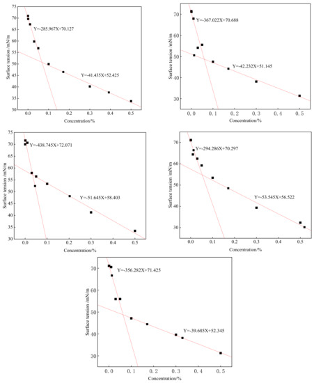 Surfactant solutions with mass fractions of 0.0001, 0.001, 0.01, 0.03, 0.05, 0.1, 0.3 and 0.5% were prepared using distilled water, the surface tension of each solution was measured with a loop method and the results are shown in Figure 5. It can be seen from Figure 5 that with increasing concentration, the surface tensions of the SDBS to SDBS-4 solutions first drop rapidly, and then the speed slowly descends, with an inflection point in the middle. This is because molecules can be aligned in an aqueous solution. Within a certain range, the higher the concentration was, the more molecules would be deposited on the surface of the solution, and the smaller the corresponding surface tension would become; however, as soon as the liquid surface was completely covered, increasing the concentration in the solution caused corresponding counterions to aggregate and form micelles [18,19,20]. At that point, the surface tension of the solution tended to be stable.