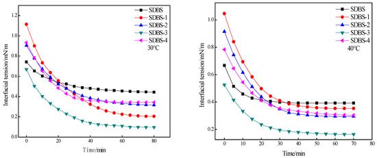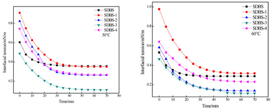 The interfacial tensions were evaluated for SDBS, SDBS-1, SDBS-2, SDBS-3 and SDBS-4. The experimental results are shown in Figure 6. It can be seen from Figure 6 that at 30 °C, the SDBS interfacial tension decreases little with time, only from 0.8 mN/m to about 0.5 mN/m. Although SDBS-1, SDBS-2 and SDBS-4 initially have interfacial tensions greater than that of the SDBS, the final values are lower than that of the SDBS, and the SDBS-3 interfacial tension is always lower than that of the SDBS, indicating that temperature, in relation to SDBS and SDBS-1 to SDBS-4, can effectively reduce oil–water interfacial tension. In order to better compare the abilities of the three and reduce oil–water interfacial tension, the temperature was increased to 40, 50 and 60 °C, respectively, and the oil–water interfacial tension was measured at the abovementioned temperature. In the experimental temperature range, the SDBS interfacial tension began to be scheduled. When the time was reduced to ~0.7 mN/m, the final reduction was not large. At the beginning of the measurement, the initial values of interfacial tension of SDBS-1 to SDBS-4 were between 0.8 and 1.0 mN/m, but they were all lower than that of the SDBS, indicating that their temperature resistance is better than that of SDBS. At the same time, at 40 and 50 °C, the interfacial tensions of SDBS-1 and SDBS-2 decreased with time. During the temperature changes, the interfacial tension of SDBS-4 decreased relatively slowly, but the interfacial tension was always less than those of the SDBS to SDBS-3. Since the ionicity of SDBS itself weakens when a methylol group is introduced into the SDBS molecule, the influence of calcium and magnesium ions on the interfacial tension of water is also small. Therefore, the influence of temperature on the abilities of the SDBS to SDBS-4 to reduce the oil–water interface is complex. Figure 6 shows a tendency to decrease first and then increase. This may be the result of the joint effect of temperature rise on solubility and adsorption power at the oil–water interface [22]. Combined with the results of the surface-tension test, it was found that the lower the surface tensions of the surfactants were, the stronger the ability to reduce oil–water interfacial tension was. Therefore, it can be considered that SDBS-1 and SDBS-2 in the SDBS-series surfactants have stronger abilities to reduce oil–water interfacial tension.