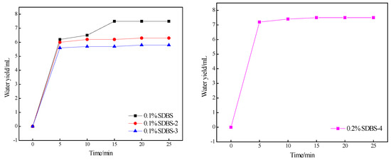 As shown in Figure 11, when the surfactant concentration is 0.1%, the precipitation rates of SDBS-2 and SDBS-3 are obviously slower than that of the SDBS, and the final precipitation water is also less than that of the SDBS; SDBS-1 and SDBS-4 did not precipitate water during the experimental time, illustrating that the SDBS-1 to SDBS-4 emulsification abilities are better than that of SDBS. When the surfactant concentration was 0.2%, with the exception of SDBS-4, the emulsions formed by the other four surfactants did not precipitate water during this experiment, indicating that the emulsifying ability of SDBS-4 is not as good as SDBS at this concentration, and the water was separated, as shown in Table 4. Rate data also led to similar conclusions. Meanwhile, from the water-dissolution-rate data in Table 3, it can be seen that as the concentration of the same surfactant increases, in addition to SDBS-4, the emulsion-precipitation rates of the other four surfactants decrease, which causes this phenomenon. The reason may be the difference in density between crude oil and water. Within a certain range, an increase in the mass fraction of a surfactant increases the diameter of the generated emulsion particles, thereby accelerating the separation of crude oil and water [25]. In addition, when crude-oil droplets float on the surface of a liquid, part of them will aggregate into a mass. At this time, increasing the concentration of the surfactant will increase the self-aggregation between the droplets of the already aggregated cluster, and the result is counterproductive [26].