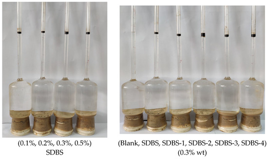 The displacement capacities of SDBS, SDBS-1, SDBS-2, SDBS-3 and SDBS-4 were tested. The experimental results are shown in Figure 12. As shown in Figure 12 (left), the oil-displacement effects of SDBS with different concentrations indicate that concentration is an important factor in oil-displacement efficacy. As the concentration rose to 0.3%, the efficiency was much higher than that at 0.1%, and at 0.5%, it was also higher than that at 0.3%. Considering the cost performance, 0.3% was chosen for further research. Figure 12 (right) shows the oil-displacement effect of the SDBS as well as its derived surfactants, and the efficiency is summarized in Table 5, which shows that SDBS-2 has the best displacement efficiency, of 25%, indicating that synthesis of SDBS-series surfactants can be greatly improved. The results show that SDBS-series surfactants (SDBS-1 to SDBS-4) can significantly reduce oil–water interfacial tension and surface tension and effectively improve oil recovery.