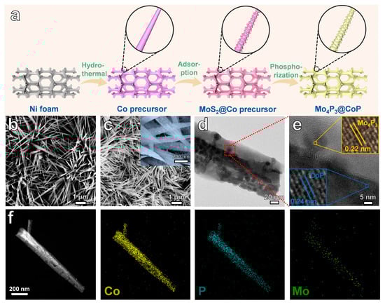 Figure 1a shows the synthesis route of bimetallic phosphide heterostructures with nickel foam as self-supporting CoP nanowires loaded with Mo4P3 nanoparticles (NPs). The detailed preparation process can be found in the experimental part. The crystal structure, morphology, and elemental distribution of the sample are demonstrated by X-ray diffraction (XRD), field emission scanning electron microscopy (SEM), and transmission electron microscopy (TEM). Firstly, Co precursor nanowires were grown on foamed nickel by the hydrothermal method, and its chemical composition could be fitted in the XRD pattern of Co(CO3)0.5(OH)0.11·H2O (Figure S1). Figure S2 shows a uniformly covered nanowire morphology with particle sizes in the range of 50~200 nm. The SEM image shows it is in sharp contrast with the smooth nickel foam in Figure S3. At the same time, the protruding and relatively large 1D nanowire structure can expose a larger specific surface area, which can not only fully contact with the electrolyte and improve the reaction efficiency but also provide more attachment sites for the subsequent MoS2 NPs, thereby increasing the number of interfaces and enhancing the efficiency of the reaction. As shown in Figure 1b, the MoS2 NPs were uniformly and densely distributed on the surface of the Co precursor nanowires after soaking for a long time. Finally, the heterogeneous bimetallic phosphide heterostructure Mo4P3@CoP/NF was obtained by further phosphating treatment. In Figure 1c, the morphology of the sample before and after phosphating is compared, the nickel foam and the nanowire structure loaded with NPs are not damaged, and the overall morphology remains unchanged. However, through high-rate SEM, it can be observed that there are some rough and granular feelings on the surface, which may be caused by phosphating (Figure 1c inset). It shows that the self-supporting structural design has suitable stability and can maintain satisfactory contact between the substrate and the support, thereby improving the electron transport and mass transfer capabilities during the catalytic reaction, as well as enhancing the tolerance and long-term stability of the catalyst. The TEM image of Figure 1d shows that the Mo4P3 NPs are uniformly grown on the surface of the CoP nanowires, their sizes are mainly distributed between 5 and 10 nm, and the small-sized NPs have more abundant surface-active sites, thus promoting the reaction process. Figure 1e shows the interplanar spacing of 0.24 nm and 0.22 nm of nanowire CoP and NPs-loaded Mo4P3, which belongs to the (111) plane of CoP and the (116) plane of Mo4P3, respectively. It is consistent with the crystal plane analysis of selected electron diffraction (Figure S4). In addition, the STEM analysis of Figure 1f shows that the Co element is mainly distributed in the middle part of the nanowires, while Mo is distributed near the surface edge of the nanowires, which is consistent with the actual structural composition analysis.