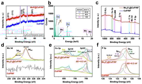 In order to further investigate the electron modulation effect at the interface between Mo4P3 NPs and CoP nanowires, X-ray diffraction (XRD) and X-ray photoelectron spectroscopy (XPS) were used to characterize Mo4P3@CoP-NF samples and to study the binding energies of the material components and valence electrons, respectively. The XRD pattern of the Mo4P3@CoP/NF sample is shown in Figure 2a, where the peaks at 31.6° and 56.8° correspond to the (011) and (211) planes of CoP (JCPDS No. 29-0497), respectively. The peaks at 44.8°, 52.2°, and 76.7° correspond to the nickel elemental of the base nickel foam. Similar to the XRD test results of MoS2@Co precursor/NF during the synthesis process (Figure S5), only a very small amount of Mo4P3 NPs (1.66%) is needed to build a uniform and appropriate interface structure on the surface of CoP nanowires (Figure 2b). In addition, the size of NPs (about 10 nm) is extremely small, and it is difficult to clearly observe the diffraction peaks of Mo4P3 NPs in the XRD mode of Mo4P3@CoP/NF. The XRD test results are consistent with expectations, but they are not enough to intuitively reflect the interaction between CoP nanowires and Mo4P3 NPs [,]. Therefore, we used the XPS test to find the interaction between them. The test results show that there are obvious Co 2p peaks and P 2p peaks in the full XPS spectrum (Figure 2c). Compared with single-phase CoP nanowires, Mo4P3@CoP has slight fluctuations in the range of Mo 3d. In order to analyze the transfer direction of electrons at the interface, after performing multiple linear regression fitting on the high-resolution fine spectrum, the binding energy changes of each element were further compared and analyzed with or without Mo4P3 NPs loading. Although the amount of Mo4P3 NPs in Mo4P3@CoP is small, compared with single-phase CoP nanowires, the signal of Mo in Mo4P3@CoP is still obvious in the high-resolution fine spectrum of Mo 3d because the Mo4P3 NPs are loaded in on the surface of nanowires, and X-rays can effectively excite valence electrons in Mo4P3 NPs. A set of spin-orbit splitting peaks at 234.20 and 231.20 eV shown in Figure 2d belong to Mo 3d3/2 and Mo 3d5/2 peaks on the NPs. Figure 2e shows that in the Co 2p spectrum, the signals of a set of spin-orbit splitting peaks at 779.20/795.06 eV originate from Co 2p3/2 and Co 2p1/2 in Co-P [,]. A group of peaks at 780.7 and 796.58 eV are the signals of Co 2p3/2 and Co 2p1/2 of the Co-O bond caused by surface oxidation of the material, and a group of satellite peaks at 784.45 and 800.95 eV [,]. Compared with the Co 2p high-resolution fine spectrum of single-phase CoP nanowires without Mo4P3 NPs, the binding energy of the corresponding peaks of Mo4P3@CoP has a shift of −0.2 eV. Coincidentally, a similar shift also appears in the high-resolution fine spectrum of P 2p. As shown in Figure 2f, the signals of a set of spin-orbit splitting peaks at 129.60 and 130.60 eV originate from P 2p3/2 and P 2p1/2 in metal phosphides, and the broad peak signal at 134.35 eV belongs to phosphate caused by air oxidation species []. Compared with single-phase CoP nanowires, the corresponding peaks in Mo4P3@CoP move −0.2 eV, respectively. Electron transfer phenomena in Co 2p and P 2p may be due to the modulation of electronic structure in the interfacial region caused by the interaction between CoP and Mo4P3 lattice, which may be conducive to the enhancement of catalytic performance.