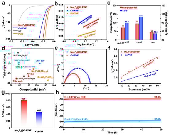 (a) Polarization curves of Mo4P3@CoP/NF, CoP/NF, NF, and Pt/C. (b) Tafel curves of Mo4P3@CoP/NF, CoP/NF and Pt/C. (c) Comparison chart of overpotential and Tafel slope. (d) HER performance comparison of the Mo4P3@CoP/NF with different catalysts published recently. (e) Electrochemical impedance of Mo4P3@CoP/NF, CoP/NF. (f) ECSA values of Cdl. (g) Mo4P3@CoP/NF and CoP/NF. (h) I−t curves at −0.07 V vs. RHE and −0.0131 V vs. RHE, respectively.