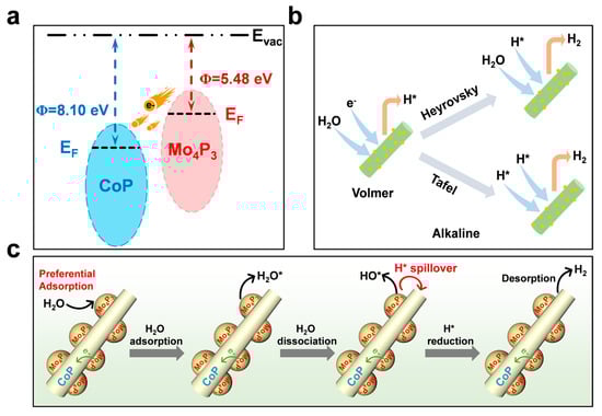In order to explore the HER catalytic mechanism of Mo4P3@CoP materials, according to previous work, we obtained that the work function of CoP materials is 8.1 eV, which is significantly higher than 5.48 eV of Mo4P3 (Figure 4a) [,]. This enables electron transfer between the CoP nanowires and the Mo4P3 NPs, and the electrons are transferred from Mo4P3 to CoP until equilibrium is reached. Finally, due to the low electrostatic potential of Mo4P3, electron loss occurs in Mo4P3 while electron gain occurs in CoP. The hydrogen evolution reaction (HER) process undergoes two different reaction mechanisms in alkaline media, as shown in Figure 4b []: