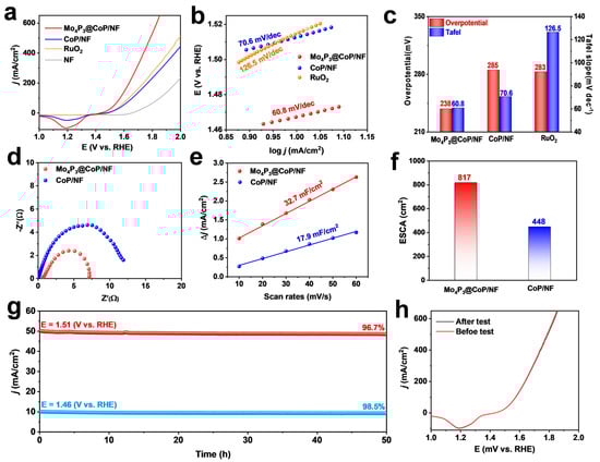 The presence of electrocatalysts on the anode electrodes can greatly reduce the overpotential of the OER and facilitate the charge transfer between electrodes and electrolytes []. The Tafel slope is an important parameter to evaluate the intrinsic activity of a catalyst in a specific catalytic reaction. Further selecting the linear part from the LSV curve, we draw the Tafel plot between the potential (V) and the logarithm of the current density (mA/cm2), where the minimum Tafel slope value indicates more efficient charge transfer and higher catalytic activity. As shown in Figure 5b, the Tafel slope of Mo4P3@CoP/NF (60.8 mV/dec) is lower than that of CoP/NF (70.6 mV/dec) and RuO2/NF (98.7 mV/dec) electrodes. It is further shown that the Mo4P3@CoP/NF catalyst can enhance the adsorption of intermediates and effectively reduce the overpotential of the corresponding catalytic half-reaction, accelerating the OER process. Thus, the activities of different catalysts can be compared by comparing the Tafel slope and overpotential at constant current density (Figure 5c). Electrochemical impedance spectroscopy (EIS) plays a vital role in the study of catalyst performance and can represent the charge transfer ability of different catalysts. According to the equivalent circuit established according to the Nyquist mode (Figure 5d), Mo4P3@CoP/NF has suitable conductivity, and CoP/NF electron transfer resistance (Rct) increases, indicating a higher charge transfer barrier and lower performance. The CV curves of Mo4P3@CoP/NF and CoP/NF at different scan rates (10~60 mV/s) in the non-Faradaic region are shown in Figure S13. The underlying formula Δj/2 = (janodic − jcathodic)/2 yields a curve versus scan rate in Figure 5e. The Cdl values of Mo4P3@CoP/NF and CoP/NF are 32.7 mF/cm2 and 17.9 mF/cm2, respectively. The ECSA value was further calculated (Figure 5f), and it was concluded that Mo4P3@CoP/NF had the largest active surface area value (817 cm2) compared to CoP/NF (448 cm2). Mo4P3@CoP/NF has a larger active surface area and more exposed active sites, and thus, the samples obtain higher OER catalytic activity. As shown in Figure 5g, the excellent stability of the sample Mo4P3@CoP/NF was further verified by chronopotentiometry, and the activity retention rate could reach 98.5% and 96.7% after continuous operation at different voltages of 1.46 V and 1.51 V for 50 h, respectively. Then in a three-electrode system, we investigated the OER catalytic performance of Mo4P3@CoP/NF after electrical stability tests by LSV. As shown in Figure 5h, the LSV curve after the stability test has no significant deviation compared with that before the test, indicating that Mo4P3@CoP/NF has high catalytic performance before and after the stability test and has a certain potential for industrial application. To further understand the composition and morphology as well as valence changes of the samples after the long-term stability test, XRD, SEM, and XPS characterization were carried out. In Figure S14, it can be observed that some changes occurred on the sample surface before and after the OER test. As shown in Figure S15, it can be seen in the XRD patterns that the diffraction peaks of each phase of CoP are preserved. However, through the XPS test of samples after OER, it was found that the proportion of the Co−O bond increased, and the binding energy of the Co element increased. We guessed that the CoP on the surface of the sample transformed into an amorphous CoOOH during the OER process (Figure S16) []. In conclusion, the catalyst Mo4P3@CoP/NF has outstanding long-term stability and catalytic activity.