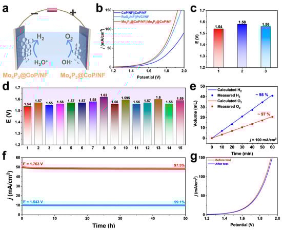 Mo4P3@CoP/NF exhibits excellent catalytic performance when used as a catalyst for HER and OER. To research the catalytic performance of Mo4P3 NPs heterostructure for overall water splitting, a double-layer catalyst using Mo4P3@CoP/NF as both anode and cathode was designed. Electrode electrolyzer and evaluated in an alkaline environment (Figure 6a). To compare their overall water-splitting capabilities, CoP/NF||CoP/NF and noble metal Pt/C/NF||RuO2/NF electrolyzers with the same mass loading were also assembled and tested under the same conditions. As shown in Figure 6b, Mo4P3@CoP/NF||Mo4P3@CoP/NF exhibits remarkably suitable catalytic performance. The control samples of CoP/NF||CoP/NF and Pt/C/NF||RuO2/NF require voltages of 1.58 V and 1.56 V to achieve a current density of 10 mA/cm2, while Mo4P3@CoP/NF||Mo4P3@ CoP/NF only needs 1.54 V to reach the same effect (Figure 6c). What is more, compared with other recently reported catalysts, it can be found that it has excellent catalytic performance for overall water splitting, indicating that it has great potential to develop into a high-performance catalyst (Figure 6d). The overall water-splitting voltage of the catalyst is certainly one of the indicators for evaluating the performance, but due to some environmental restrictions in practical applications, we must consider the hydrogen generation efficiency of the catalyst. As shown in Figure 6e, the faradaic efficiencies of hydrogen and oxygen of Mo4P3@CoP/NF are about 98% and 97%, respectively, in the overall water splitting, indicating that the catalyst can save much energy loss in industrial applications and ensure energy conservation. In addition to having satisfactory catalytic performance and high catalytic efficiency, the stability of material samples is also a factor that must be considered. The I-t curve test of the sample is shown in Figure 6f. It still has a stable current density after 50 h at high voltages of 1.543 V and 1.763 V, and the LSV curve before and after the test basically does not change (Figure 6g). This is a closer illustration that it has excellent catalytic durability and mechanical stability, which is mainly due to the structural stability of the self-supporting design, which ensures a tight connection between the active materials and the electrode.