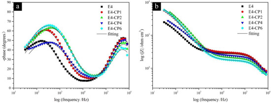 The Bode plot contains the phase angle-frequency plot, and the module of impedance-frequency plot is shown in Figure 4. This is consistent with the Bode-phase plot which means two different processes occurred. In the range of the second semicircle in the medium frequency region, the diameter of the semicircle increased with the addition of 1 mL CP and 2 mL CP, respectively. Then, it decreased slightly with the addition of 4 mL CP, and it increased again with the addition of 6 mL CP. It can be noted in Figure 4 that the phase angle and module of impedance increased as CP was added. The fitting curves, no matter the Nyquist plot or the Bode plot, showed good consistency with experiment results which reflected in the small relative error of those EIS parameters shown in Table 2. It contains the solution resistance (Rs), the outer layer constant phase element (CPE1), the passivating film pseudo resistance (Rfilm) [35,36,37], the inner layer constant phase element (CPE2), and the charge transfer resistance (Rct). All the above parameters were fitted by Zview software (Version 3.1, Scribner Associates Inc., Southern Pines, NC, USA).