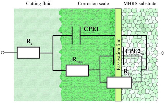 The equivalent circuit was proposed as shown in Figure 5. As listed in Table 2, the solution resistance Rs in each set of experiments were around 35 Ω·cm−2, resulting from an electrolyte environment with similar conductivity as shown in Figure 6. The addition of CP caused a slight reduction in conductivity of cutting fluid relevant to the insulation of CP, and the mean of conductivity of those cutting fluids was 1.406 ms/cm. It is difficult to obtain a pure capacitor in the electrochemical process. Usually, CPE is used to approximately replace the capacitance. The CPE element is represented by Equation (1) [38,39,40]: