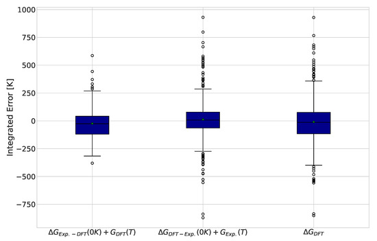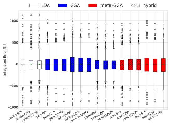 As previously mentioned, an erroneous sign of alone does not provide a full quantitative picture of the accuracy of the DFT predictions for reactions with changing compositions. The results for the integrated extent of reaction errors are displayed in Figure 1. It is important to note that PBE0 had the lowest integrated error on average; however, specific molecules may display better performance levels with different functionals. High absolute values indicate a high degree of prediction inaccuracy. The sign reflects changes at lower (negative) or higher (positive) temperatures as compared to the experimental cases. Interestingly, all combinations of functionals and basis sets had mean values close to 0 K, meaning that the errors had little to no preference for over- or underestimating the transition temperature. Additionally, the exchange–correlation functionals had similar behaviors in terms of spread. This is in agreement with thermodynamic values reported for some solids [47]. The standard deviations of the integrated errors for all functionals were within the range of 355 to 488 K.