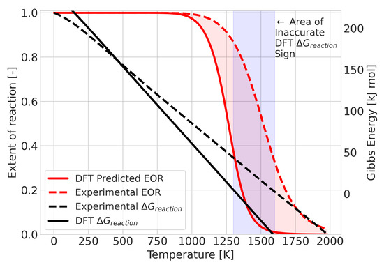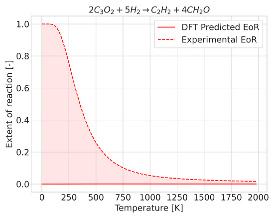 In most reactions, we found that prediction errors mostly consisted of the extent of reaction change taking place at a different temperature to the experimental one. We observed that cases with a high degree of error may be qualitatively correct, i.e., with the extent of reaction evolving in the proper direction with temperature, although the inflection point, corresponding to the change in sign of , occurs at a very different temperature to the experimental one. In such cases, if the predicted extent of reaction were to be shifted by the integrated error but in the opposite direction, predictions would become far more accurate. Whilst this was the most common behavior, some reactions displayed an incorrect extent of reaction, even at low temperatures. The deviation improved as the temperature increased (see Figure 2). In these cases, DFT predicted a fixed composition over the temperature range, although a change in composition took place experimentally. Separating the cases in which this happens is a rather difficult task, as the average enthalpy (which for the case of temperature-independent equilibrium compositions was very different, and distinguishing accurate and inaccurate predictions no longer allows such distinctions) lies very close to the value needed to properly describe the reactions.