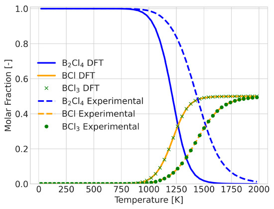 Reaction composition for the reaction BCl + BCl→ BCl with incorrect signs for the Gibbs energy of the reaction between 1300 and 1600 K, showing good qualitative information.