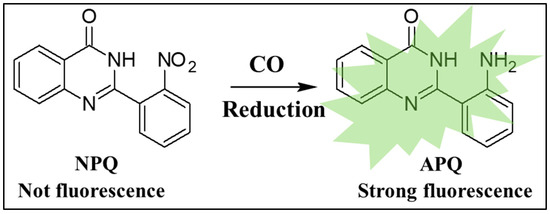 In the present work, we developed NPQ, a highly sensitive and selective quinazolinone-based fluorescent probe for CO detection. NPQ could be synthesized easily in a one-step reaction using inexpensive and readily available materials. The nitro group of NPQ is reduced to an amino group by the reaction with CO to emit strong fluorescence around 500 nm. NPQ turned on its fluorescence towards CO selectively and showed very good tolerance to different interferents, including various anions and metal ions, oxidants, reductants, and even free radicals. NPQ could detect CO with good sensitivity down to the detection limit of 0.73 µM. Finally, NPQ could be applied to develop a test paper for the visual detection of CO in the vapor phase.