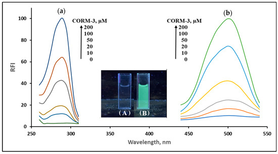 (a) The excitation spectra (λex = 500 nm) and (b) emission spectra (λex = 280 nm) of NPQ (30 µM) upon the addition of different concentrations of CORM-3 (0, 10, 20, 50, 100, 200 µM). The reaction time was 30 min at room temperature. The solvents for NPQ and CORM-3 are as described in the experimental section. The insets are (A) a photograph of NPQ (30 µM) and (B) a photograph of NPQ (30 µM) upon the addition of CORM-3 (100 µM). RFI refers to relative fluorescence intensity.