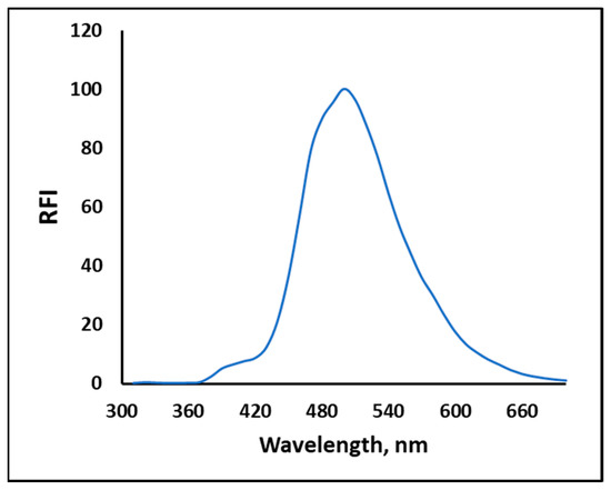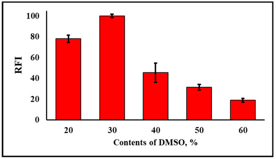 From Table 1 and Figure 5b, increasing solvent polarity led to a red shift in the maximum fluorescence wavelength of APQ (Figure 5b), till it reached 500 nm upon using PBS buffer (pH 7.0, 10 mM, containing 30% DMSO) as a solvent (Figure 3). This demonstrates that the fluorescence emission of APQ relies on the formation of the ICT state upon excitation [35,41]. As polar solvents stabilize the charge-transfer states, the highest ICT emission is usually observed in polar solvent mixtures such as water/DMSO mixture. However, from APQ structure, it could form an intramolecular hydrogen bond, which in the presence of a high amount of water, could lead to fluorescence quenching due to the formation of mixed intramolecular and intermolecular hydrogen bonds [44]. Consequently, we investigated the contents of DMSO in the PBS buffer, and good fluorescence intensity was obtained in the 20% DMSO, which was increased with increasing DMSO % to 30. After that, increasing the DMSO amount to 40% led to a decrease in fluorescence intensity. Then, as the DMSO increased, the fluorescence intensity decreased. From the previous results, the best composition of polar solvent mixtures that stabilizes the charge-transfer states and retains the intramolecular hydrogen bond with the minimum intermolecular hydrogen bond is PBS buffer containing 30% DMSO. Hence, the best condition was using 30% DMSO, which yielded the highest RFI (Figure 10). It is noteworthy that this nonlinear relation between the solvent water content and fluorescence intensity of quinazoline derivatives is similar to what was reported by Wang et al. [33].