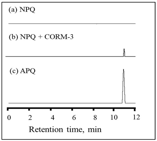 To confirm the suggested reaction mechanism, HPLC experiments were performed to prove the conversion of NPQ to APQ by comparing the retention times (Figure 4). The used HPLC conditions are mentioned in Figure 4. Since NPQ is a non-fluorescent compound, a signal peak was not observed on its chromatogram (Figure 4a). On the other hand, when CORM-3 was added to NPQ, a signal peak was detected at 11 min (Figure 4b), the same retention time as that of APQ (Figure 4c). These results show that the NPQ is converted to the highly fluorescent APQ by the reducing ability of CO [21,34].