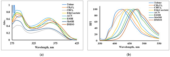 (a) Absorption spectra and (b) normalized emission spectra (λex = 280 nm) of APQ (30 µM) in different organic solvents.
