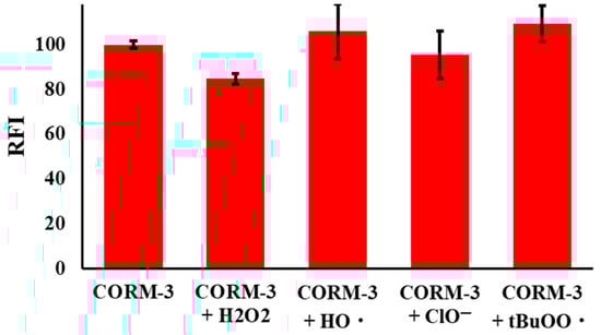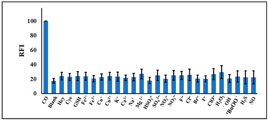 To evaluate the selectivity of the reaction of NPQ with CO, the change in fluorescence was measured with the addition of typical reductants, including Fe2+, Cys, Hcy, and GSH, reactive oxygen species, including H2O2, •OH, ClO−, and tBuOO•, and gaseous transmitters including H2S and NO. Hydroxyl radical (•OH) and tert-butoxy radical (tBuOO•) were generated by a reaction of 100 µM Fe2+ with 1 mM H2O2 or 1 mM TBHP, respectively. Moreover, various metal ions and anions’ possible interference was tested, including the effect of Fe (III), Fe(II), Cu(I), Cu(II), K+, Ca2+, Na+, Mg2+, sulfate, hydrogen sulfate, nitrate, nitrite, fluoride, bromide, chloride, and perchlorate. As shown in Figure 6, the fluorescence of NPQ was enhanced only when CORM-3 was added, and little change in fluorescence was observed after the addition of other substances instead of CORM-3. Furthermore, the presence of reactive oxygen species in competitive experiments did not affect the fluorescence enhancement of NPQ by CO (Figure 7). Therefore, it was confirmed that NPQ has excellent selectivity for CO.
