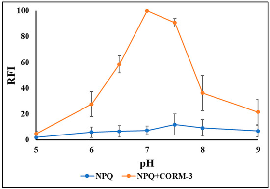 The effects of pH on the fluorescence intensity of NPQ (30 µM) upon the addition of CORM-3 (100 µM). The reaction time was 30 min at room temperature. The solvents for NPQ and CORM-3 are as described in the experimental section, except for pH.